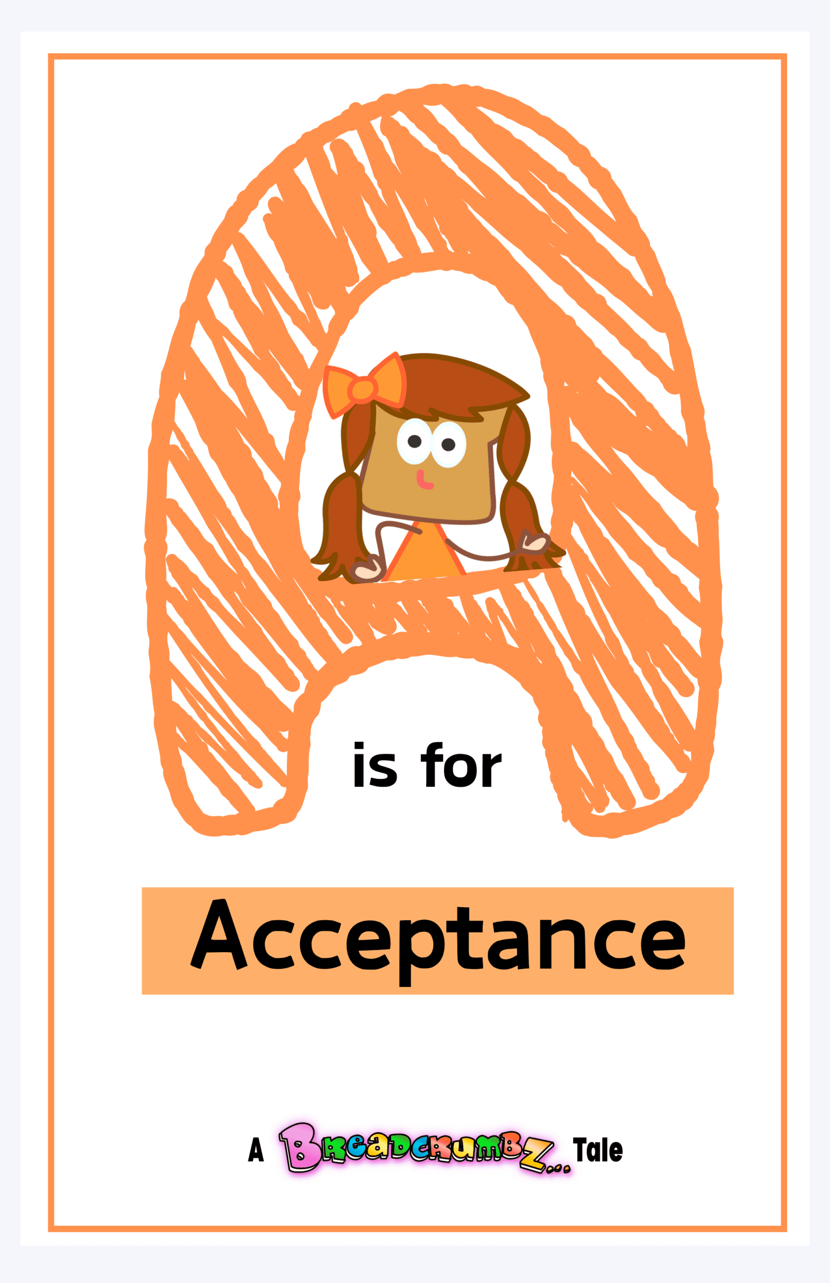 Picture of the letter A with orange scribbles in it and Whitney Wheat on the inside circle, with the words "A is for Acceptance," and "A Breadcrumbz Tale."